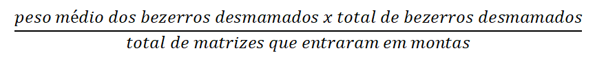 | Desmama | Nº bezerros desmamados ÷ Nº fêmeas na estação reprodutiva | x100 | >75% |