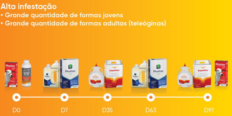 IMPORTANTE: É bom lembrar que o grau de infestação, a quantidade de tratamentos e o intervalo entre tratamentos serão diferentes em cada propriedade e em cada região. Devemos manter uma vigilância constante pra identificar o momento correto de tratamento.