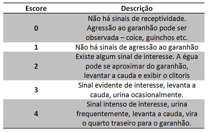 A elevação dos níveis de estrógeno e hormônio luteinizante (LH) precede a ovulação, enquanto a progesterona encontra-se em níveis basais. Este balanço hormonal confere características clássicas de uma fêmea em estro, que podem ser classificadas de acordo com o grau de receptividade da fêmea equina ao garanhão num escore de 0 a 4, conforme pode ser observado na tabela abaixo: