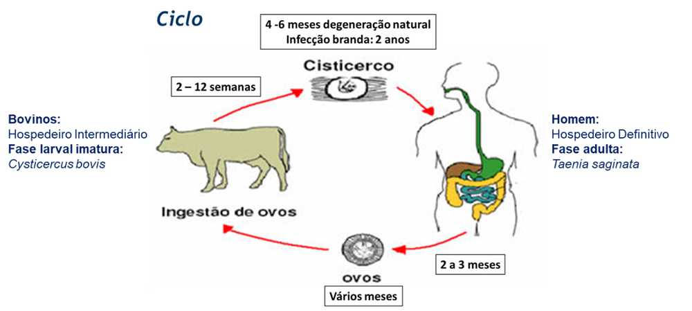 Após cerca de 45 a 55 dias após a ingestão de ovos, o bovino desenvolverá a cisticercose na carne, que ao ser ingerida por seres humanos, desenvolverá uma solitária, fechando o ciclo. A solitária pode ser encontrada no intestino humano mesmo depois de 10 anos após a ingestão. Estima-se que mundialmente haja mais de 70 milhões de pessoas com teníase/solitária o que possibilita a contaminação ambiental e infecção dos animais mantendo o ciclo biológico sempre atual.