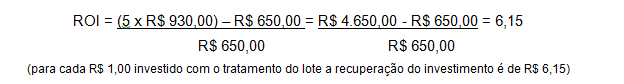 Numa simulação com 5% de cisticercose “viva” ao abate o produtor pode receber um desconto médio de 30% sobre a arroba paga pelo frigorífico para cada animal identificado com a doença e muitas vezes perder totalmente o valor do animal destinado a graxaria (Critérios Art. 185, SIF 2018). Considerando o valor da arroba do boi gordo a R$ 155,00 em 03/04/2019, um abate de 100 animais (20@/cada animal = R$ 3.100,00) pode representar um desconto 30% (-R$ 46,50/@) para cada animal o que equivale ao prejuízo de R$ 930,00/boi identificado. Considerando o custo médio de R$ 650,00 para as três aplicações no tratamento do lote de 100 animais, o retorno sobre o investimento (ROI) seria de: