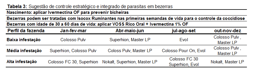 Para o controle de parasitas em bovinos de leite sugerimos quatro tipos de manejo de acordo com a categoria animal: bezerras, novilhas, vacas em lactação e secagem (Tabelas 3 e 4). É muito importante que um médico-veterinário acompanhe o grau de infestação de parasitas para recomendar o melhor método de controle.