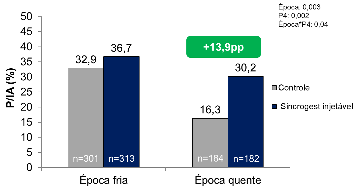 A suplementação com o Sincrogest Injetável® após a inseminação, associada às práticas de manejo, são importantes ferramentas para amenizar os danos causados pelo estresse térmico. A combinação destas estratégias pode ser uma alternativa para um programa reprodutivo rentável e bem-sucedidodurante o verão.
