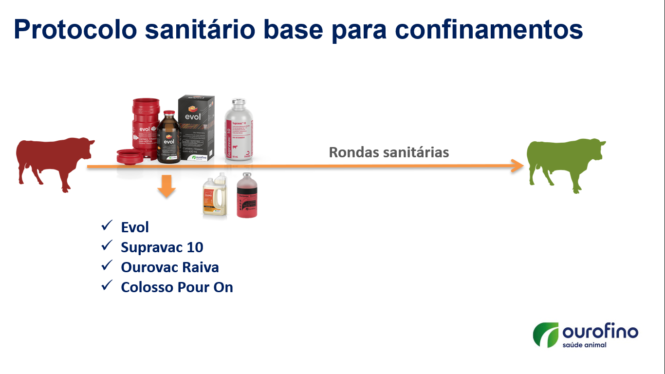 Quando o assunto é controle sanitário, na entrada do confinamento é importante que todos os animais sejam padronizados, há uma grande necessidade de se criar uma identidade sanitária e imunológica consistentes, pois será a última chance que estes animais terão para serem tratados contra verminoses e imunizados contra enfermidades potencialmente fatais no confinamento. Evol é o mais completo e potente endectocida da atualidade recomendado para animais confinados com apenas 22 dias de carência, atendendo as exigências da Instrução Normativa nº 48 DAS – 2011) e Supravac 10, previne as pneumonias virais e bacterianas. Em algumas regiões há necessidade de prevenção contra a raiva com a Ourovac Raiva e devido a presença de alguns lotes que chegam com mais carrapatos, Colosso Pour On é viável e imediatamente eficaz contra as infestações.