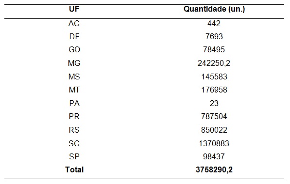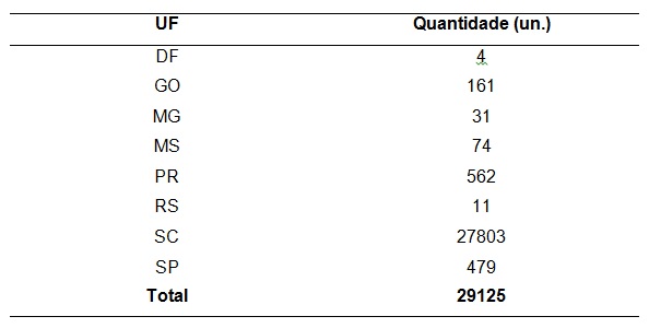 Tabela 1: Condenação (total ou parcial) de carcaças suínas por unidade federativa, devido ocorrência de sarna.