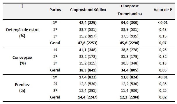 BRUSVEEN, D.J.; SOUZA, A.H.; WILTBANK, MC. Effects of additional prostaglandin F2alpha and estradiol-17beta during Ovsynch in lactating dairy cows.Journal of Dairy Science, v.92, p.1412–1422, 2009. GÜMEN, A.; GUENTHER, J.N.; WILTBANK, M.C. Follicular size and response to Ovsynch versus detection of estrus in anovular and ovular lactating dairy cows. Journal of Dairy Science, v.86, p.3184–3194, 2003. MARTINS, J.P.; POLICELLI, R.K.; PURSLEY, J.R.; Luteolytic effects of cloprostenol sodium in lactating dairy cows treated with G6G/Ovsynch. Journal of Dairy Science, v.94, p.2806–2814, 2011. MCCRACKEN, J.A.; CUSTER, E.E.; LAMSA, J.C. Luteolysis: a neuroendocrine-mediated event. Physiological Reviews, v.79, p.263–323, 1999. MOREIRA, F.; RISCO, C.A.; PIRES, M.F.; AMBROSE, J.D; DROST, M.; THATCHER, W.W. Use of bovine somatotropin in lactating dairy cows receiving timed artificial insemination. Journal of Dairy Science, v.83, p.1237–1247, 2000. PURSLEY, J.R.; MARTINS, J.P.N.; WRIGHT, C.; STEWART, N.D. Compared to dinoprost tromethamine, cloprostenol sodium increased rates of estrus detection, conception and pregnancy in lactating dairy cows on a large commercial dairy. Theriogenoloy, v. 78, p.823-829, 2012.