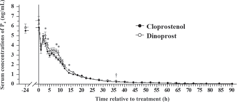 Diversos são os hormônios envolvidos no controle do ciclo estral bovino. Entretanto, nesse artigo iremos nos ater a prostaglandina (PGF2α) e as suas diferentes moléculas disponíveis na prática veterinária. Para isso, devemos entender primeiramente como esse hormônio tão importante atua. O corpo lúteo (CL) é a estrutura formada no ovário após a ovulação, e sua função é produzir a progesterona (P4), responsável pela manutenção da gestação. Já, a prostaglandina é produzida no endométrio e está envolvida com a regressão do CL. Assim, quando esta molécula atua, o CL regride e consequentemente ocorre queda nos níveis plasmáticos de P4. Esse fato estimula a pulsatilidade do hormônio luteinizante (LH), o que promove o crescimento final do folículo dominante/ovulatório podendo culminar em uma ovulação. Devido à função luteolítica da PGF2α, a mesma é amplamente utilizada em programas reprodutivos, seja como indutor de cio para inseminação artificial (IA) convencional, seja nos protocolos para inseminação artificial em tempo fixo (IATF). A prostaglandina natural é um hormônio muito instável e de difícil produção. Assim, ao longo dos anos diversos trabalhos foram feitos no intuito de desenvolver drogas que tivessem efeitos similares a mesma. De maneira geral, existem no mercado alguns análogos sintéticos de PGF2α entre eles, o dinoprost trometamina e o cloprostenol sódico, que é a droga mais utilizada mundialmente para esse fim. A diferença principal dessas moléculas, é que o cloprostenol possui um anel de cloro benzílico em sua molécula, o que reduz a ação enzimática responsável pela degradação, tornando-o mais resistente ao metabolismo endógeno quando comparado ao dinoprost. Essa característica faz com que o cloprostenol sódico tenha meia vida plasmática 23 vezes maior que o dinoprost (aproximadamente 3 horas vs 8 minutos, respectivamente; MACCRACKEN et al., 1999). Esse diferencial entre os fármacos pode estar relacionado ao tempo de ação e intervalo entre a administração da prostaglandina e a luteólise. Martins et al. (2011), realizaram um trabalho para avaliar a concentração plasmática de progesterona de vacas de leite tratadas com dinoprost trometamina e cloprostenol sódico (Figura 1). Nesse estudo, os animais tratados com cloprostenol apresentaram um efeito luteolítico mais rápido, apresentando concentração de P4 circulante mais baixa que as fêmeas tratadas com dinoprost nas primeiras 12 horas após a administração dos hormônios. Nesse sentido, a rápida queda nos níveis plasmáticos de P4 é de extrema importância, principalmente nas primeiras 56 horas após a administração do agente luteolítico, já que os valores de progesterona devem estar abaixo 0,5 ng/mL para que a vaca tenha maior chance de ovular o folículo dominante (FD). Com a redução acentuada da progesterona, a pulsatilidade de LH intensifica, possibilitando um aumento na produção de E2 pelo FD e, consequentemente, aumenta a manifestação de cio.