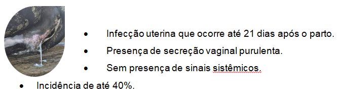 A contaminação do útero pode ocorrer no momento do parto ou nos primeiros dias seguintes. Esses agentes patogênicos devem ser eliminados durante o processo de involução uterina. No entanto, pode haver comprometimento da função imune da fêmea e resultar no estabelecimento de diferentes quadros de infecções.