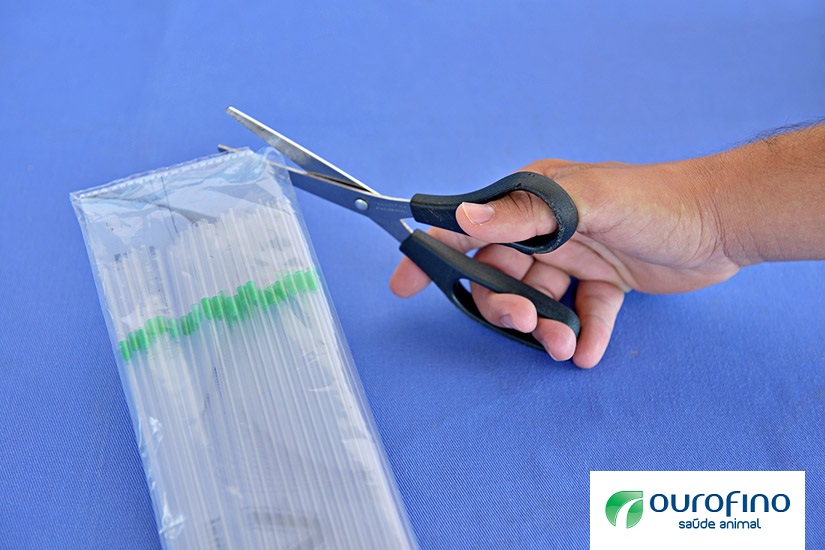 Primeiramente, deve-se cortar uma pequena abertura no saco plástico de bainhas (Figura 11). Na extremidade que contém a bucha, exteriorize a ponta de uma bainha por vez, lembrando que não é recomendado exteriorizar totalmente a bainha até o momento da inseminação.