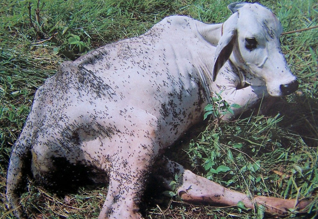 Em seu ciclo de vida, essa mosca não apresenta especificidade de hospedeira para seu parasitismo e pode ser vetor mecânico e biológico de inúmeras enfermidades transmitindo agentes patogênicos como Anaplasma spp, Habronema spp ou ainda o vírus da Anemia Infecciosa Equina (AIE), podendo picar e se alimentar inclusive do homem (CASTRO et al, 2008; FÖRSTER et al. 2007; GOMES, 2008). O surto ocorrido recentemente no município de Santa Rosa do Viterbo no Estado de São Paulo não é fato isolado, já ocorreu em outros anos e em outras regiões do Brasil, por exemplo, em Santa Eudóxia (SP), em 2007; no Mato Grosso e no Mato Grosso do Sul, em outubro de 2009; em Frutal (MG) e Planalto (SP), em 2009. Os fatores coincidentes nesses relatos foram: épocas climáticas semelhantes, com altas temperaturas e umidade, micro condições regionais criadas pelo homem com a destinação de subprodutos agrícolas (bagaço de laranja e de cana e cama de frango), relação com os períodos da safra de cana-de-açúcar, que acontecem concomitantemente com a época climática ideal. Dentre os fatores que favorecem a reprodução dessas moscas estão as regiões de produção animal (tanto leite, quanto carne), onde há acúmulo de esterco (bovinos, suínos, aves e equinos), a relação parasito versus hospedeiro; regiões de franca produção canavieira (grandes lavouras de cana com produção de vinhaça e vinhoto); relação ciclo reprodutivo do parasito versus matéria orgânica em decomposição; regiões com plantações de laranja ou outras culturas em que se use o resíduo da cana ou esterco de animais, principalmente granjas avícolas ou de suínos e falta de orientação aos produtores sobre o ciclo de vida da mosca, entre outras informações. Ciclo biológico da Stomoxys calcitrans 1) O ciclo de vida da mosca dos estábulos varia de12 a60 dias, estando diretamente relacionado às características climáticas da região. 2) Uma fêmea adulta pode produzir até 632 ovos, fazendo mais de 20 posturas em toda a vida. 3) Os estágios de desenvolvimento compreendem: ovo, larva, pupa e adulto. Depois de depositados pelas fêmeas em matéria em decomposição, os ovos eclodem de um a quatro dias, entretanto, este período pode se prolongar em ambientes de baixa temperatura ou ser reduzido em locais de temperaturas mais altas. Após a eclosão, as larvas se alimentam de material orgânico vegetal e amadurecem num intervalo de seis a 30 dias. A pupação pode durar de seis a 10 dias, estando diretamente relacionada à temperatura e à umidade as quais as pupas foram expostas. Nos locais de temperaturas mais elevadas a mosca-dos-estábulos desenvolve-se continuamente, não havendo interrupção do ciclo de vida ao longo do ano. Geralmente, os adultos de S. calcitrans vivem por até um mês. Ocorrida a emergência, a fêmea inicia a oviposição após nove dias aproximadamente. A alimentação leva aproximadamente três minutos, mas é constantemente interrompida em consequência da dor ocasionada por sua picada nos animais parasitados. Nos animais, além de transmitirem agentes potencialmente patogênicos, causam muito incômodo, anemia e queda da produção. Orientações Gerais: 1) Medidas de higiene preventiva compõem 90% do controle dessa mosca. 2) Em casos de problemas com estes insetos ou qualquer outro parasito, buscar sempre o suporte técnico veterinário atentando-se para especialistas na área. 3) O diagnóstico preciso das condições que proporcionam a reprodução das moscas bem como a retirada dessas condições são ações imprescindíveis ao sucesso do controle. 4) A baixa eficácia nem sempre é culpa do inseticida aplicado; muitas vezes a baixa eficácia é decorrente do uso incorreto do mesmo. Atente-se sempre às instruções do médico veterinário e do fabricante do produto. 5) O uso inadequado de mosquicidas (inseticidas), uso de superdoses ou subdosagens e a falta de ação conjunta entre os fazendeiros acabam por dificultar o controle. 6) A destinação correta dos resíduos da produção agrícola e da pecuária é primordial para se evitar vários problemas ambientais e sanitários. As moscas são apenas um dos problemas da não destinação correta e do manejo incorreto de dejetos. 7) Em geral, os problemas com moscas Stomoxys calcitrans são criados por uma associação de fatores ambientais e de manejo equivocado de dejetos. 8) Para o controle da S. calcitrans, a redução da fonte onde ela se prolifera é de fundamental importância. Devem ser evitados potenciais criadouros com a remoção regular de camadas úmidas, feno, resíduos alimentares e resíduos dos estábulos (alojamentos dos animais). 9) As administrações de inseticidas à base de organofosforados, piretróides, na forma de aerossol/pulverização dentro e em volta dos estábulos e das instalações rurais proporcionam bom controle local (URQUHART et al., 1998). Pode-se utilizar o cloreto de alquil dimetil benzil amônio [CB-30 TA Ourofino,diluir 01 (um) litro do produto em 2.000 litros de água] para a limpeza e desinfecção dessas instalações. O controle químico nos animais pode ser feito com a utilização de produtos ectoparasiticidas organofosforados (exemplos: clorpirifós, diclorvós, diazinon, entre outros), associados ou não aos piretroides (exemplos: cipermetrina, deltametrina, entre outros), administrados pela via pour on e pulverização. Exemplos de produtos comerciais: Cypermil Plus (Pulverização):diluir 01 (um) litro do produto em 400 litros de água; misturar bem até perfeita homogeneização da calda, com auxílio de pulverizador manual ou elétrico, banhar toda superfície do animal, principalmente nas partes baixas do animal (patas e abdômen) no sentido contrário aos pelos, utilizar aproximadamente de 04 (quatro) a 05 (cinco) litros por animal adulto; Colosso Pulverização: o produto deve ser diluído em água limpa. Para pulverização:1 litro de Colosso Pulverização dilu