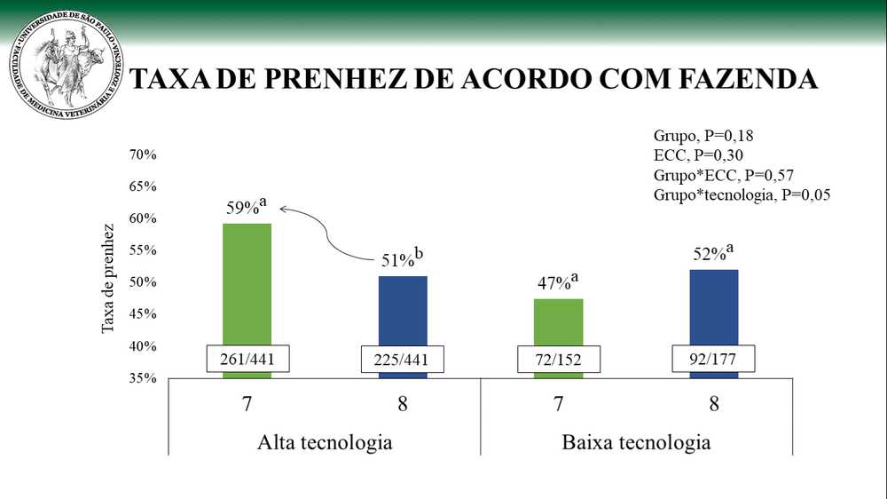 Neste outro gráfico, a taxa de prenhez na IATF é de novilhas Nelore que receberam 7 ou 8 dias de dispositivo de progesterona, em manejo de alta tecnologia e baixa tecnologia nutricional.