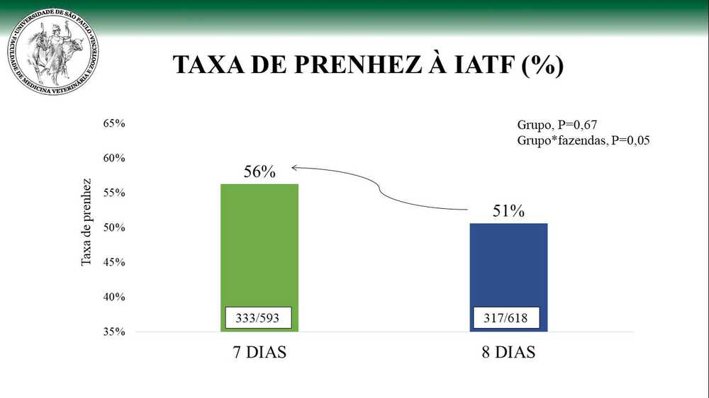 Este gráfico mostra a taxa de prenhez na IATF de novilhas Nelore que receberam dispositivo de progesterona por 7 ou 8 dias.