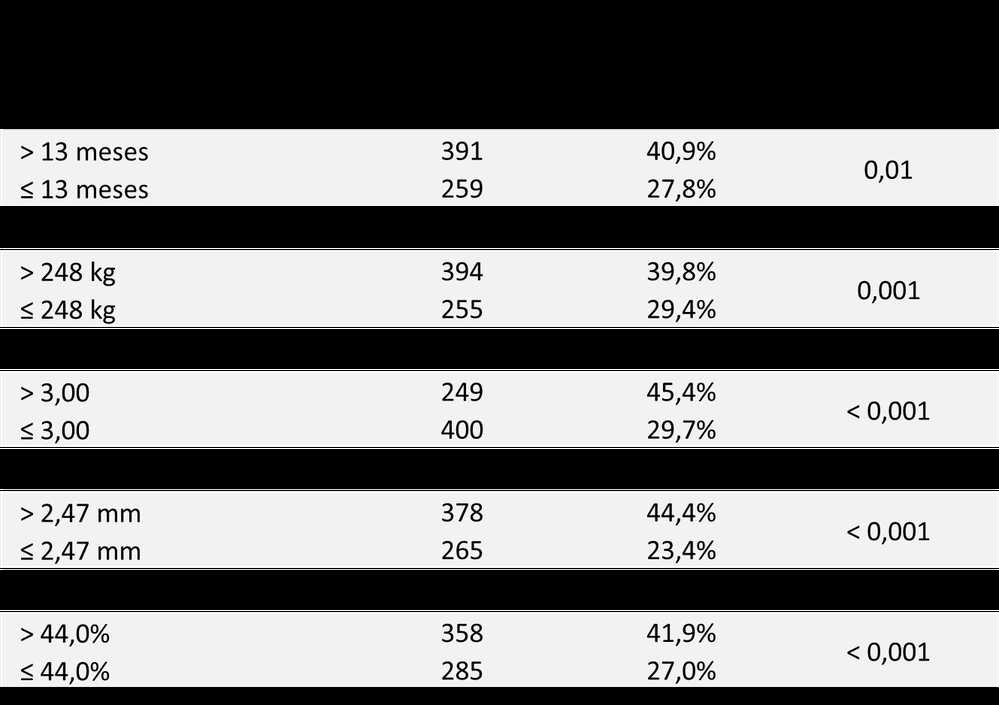 Pensando-se no modelo taurino, no qual as fêmeas podem atingir a puberdade de 6 a 12 meses anteriormente às fêmeas zebuínas (Nogueira, 2004), cerca de 95% das novilhas na região central e nordeste dos EUA são cobertas pela primeira vez ao redor dos 12-14 meses de idade, resultando em idade ao primeiro parto de 24 meses (Day and Nogueira, 2013). Ao se transpor esse modelo para novilhas Nelore, a exata relação entre o desenvolvimento corporal e a eficiência reprodutiva tem sido estudada, com o objetivo de se elencar os fatores que influenciam a resposta ao protocolo de IATF. Em recente estudo com novilhas Nelore com média de 14 meses de idade (Freitas et al., 2014), observou-se efeito de diversos parâmetros de desenvolvimento corporal com o resultado da IATF. Fêmeas que possuíam maior ECC, peso, idade, gordura subcutânea e porcentagem de costela (tamanho da costela pela altura do animal) obtiveram melhores taxas de prenhez (tabela 1).