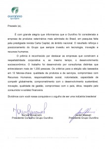 20 dez 2010Reconhecimento Nacional Vejam a carta de agradecimento dos presidentes do Grupo Ourofino: (clique em cima para visualizar) Por Assessoria de Imprensa Ourofino Agronegócio. NoneNoneNewsletterCadastre seu e-mail e receba nossa newsletter.Nome: E-mail: Ocupação: RevendaPecuaristaVeterinárioZootecnistaAgrônomoEstudante de veterináriaEstudante de zootecniaEstudante de agronomiaOutros Li e aceito os termos da política de privacidade. Deixe o seu comentárioNome:E-mail:Celular:Ocupação:---------RevendaPecuaristaMédico VeterinárioZootecnistaAgrônomoEstudante de veterináriaEstudante de zootecniaEstudante de agronomiaOutroFunção:---------BalconistaCompradorGerenteProprietárioOutroCNPJ:CPF:Segmento:---------AvesSuínosCorteLeiteEquinosOutroFaz IATF?:---------SimNãoEstado:-- Selecione o estado --ACALAPAMBACEDFESGOMAMTMSMGPAPBPRPEPIRJRNRSRORRSCSPSETOCidade:Comentário: Quero receber informações, novidades e lançamentos da Ourofino no meu e-mail. Li e aceito os termos da política de privacidade.