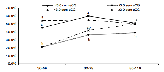 Gráfico 1:Distribuição da taxa de concepção conforme período pós parto, escore de condição corporal e tratamento com eCG. Eixo x: Taxa de concepção; eixo y: período pós parto. Adaptado de Ayres et al., 2007.