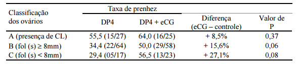 Tabela 1: Taxa de prenhez à inseminação artificial em tempo fixo conforme classificação da funcionalidade ovariana de vacas Nelore lactantes tratadas com dispositivo intravaginal de progesterona (DP4) associado ou não ao tratamento com eCG na retirada do dispositivo (Dia 8). Adaptado de Baruselli et. Al, 2003.