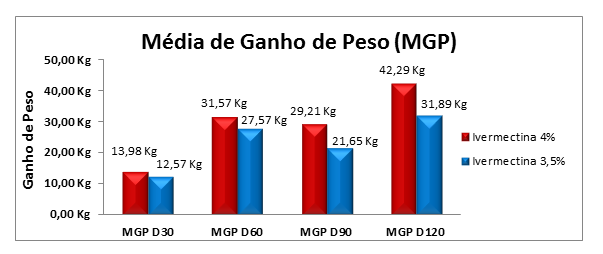 Gráfico 1. Média do ganho de peso (MGP) dos bovinos pertencentes aos grupos Master LP (ivermectina 4% longa ação) versus endectocida marca B (associação de ivermectina 2,25% com abamectina 1,25%). Fazenda Santa Carmem. Mirante do Paranapanema - SP. 2017.