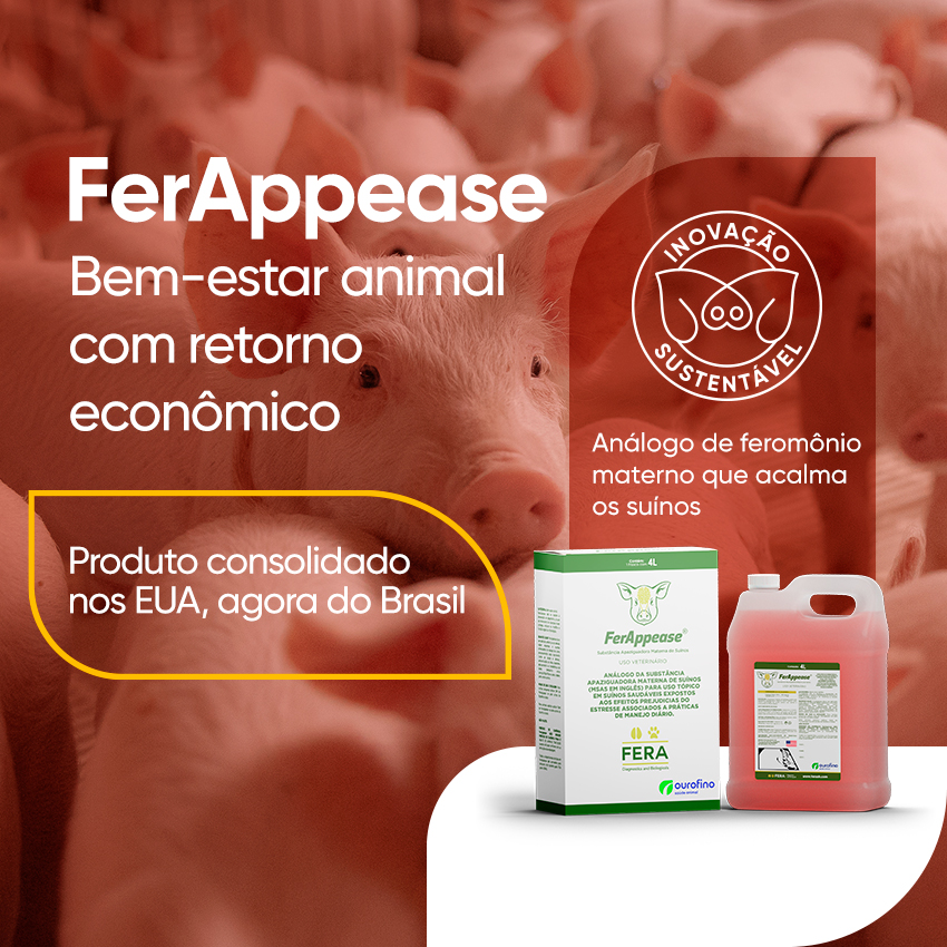 A Ourofino Saúde Animal traz para o mercado brasileiro o produto FerAppease, um feromônio sintético análogo à substância apaziguadora materna suína (SAMS), naturalmente produzida pelas fêmeas, capaz de reduzir o estresse e o medo e suas consequências negativas em suínos de todas as idades, proporcionando bem-estar aos animais e retorno econômico ao produtor.