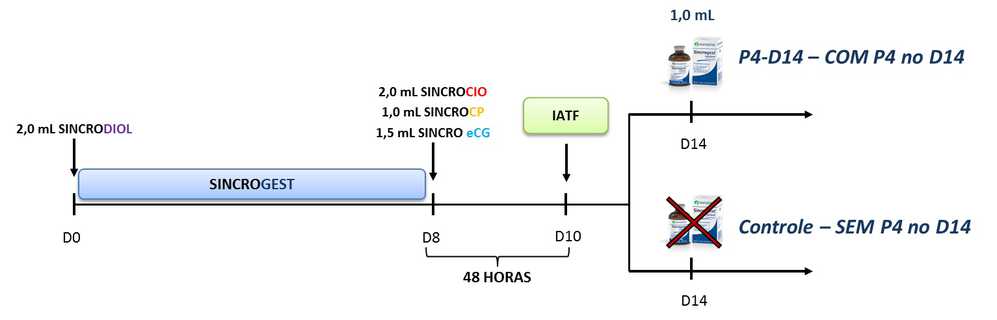 Figura 2.: protocolo de IATF utilizado nos estudos à campo e randomização dos tratamentos no D14 (Controle – sem tratamento adicional; P4-D14 – 1,0mL de Sincrogest injetável)