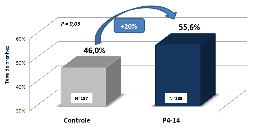 Os resultados indicaram que a administração de Sincrogest injetável, 4 dias após a IATF, aumentou em 26,7% a taxa de prenhez de vacas da raça Nelore paridas com ciclicidade desconhecida (Figura 3).