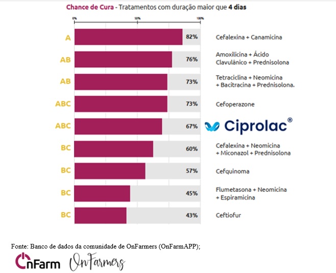Nessa segunda avaliação, foi observado que o Ciprolac está entre as melhores bases farmacológicas para tratamento com terapia estendida, aquela realizada principalmente para bactérias de difícil controle como S. aureus e S. uberis que são bastante desafiadores e tendem a cronificar o caso clínico. Ciprolac foi eficaz na cura clínica desse perfil de bactérias analisado, mostrando sua alta permeabilidade na glândula, mesmo em casos mais difíceis. Tratamento assertivo e com baixo descarte no leite.